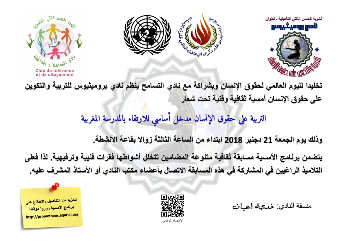 تخليدا لليوم العالمي لحقوق الإنسان وبشراكة مع نادي التسامح ينظم نادي بروميثيوس للتربية والتكوين على حقوق الإنسان أمسية ثقافية وفنية تحت شعار